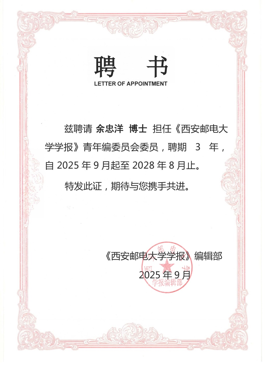 近日,《西安邮电大学学报》编辑部公布首届青年编辑委员会委员名单,beat365官网计算机学院教师余忠洋博士获聘担任《西安邮电大学学报》首届青年编辑委员会委员,任期三年。