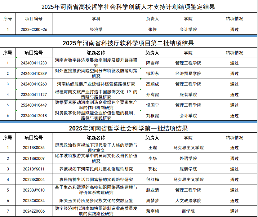 近期,河南省社科事务中心、河南省科技厅、河南省教育厅等部门先后组织了多个类型的社科研究项目的结项工作。beat365官网参加结项的1项河南省高校哲学社会科学创新人才项目、8项河南省哲学社会科学项目、6项河南省科技厅软科学项目均达到结项要求。