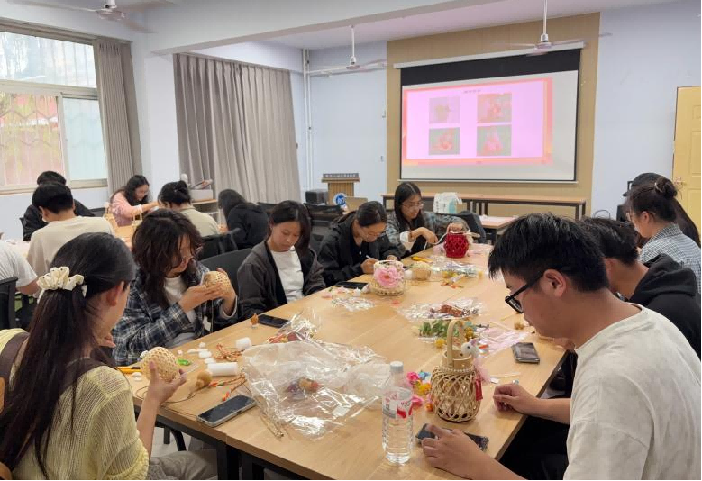 活动伊始,邓老师结合精心准备的幻灯片与实物展品,从中秋节“祭月、赏月、赏灯” 的传统习俗起源讲起,细致梳理了从唐代宫廷花灯到宋代民间灯市、再到现代创意花灯的演变历程,重点介绍了竹编、藤编等传统工艺在花灯制作中的传承与创新。她一边讲解,一边展示提前制作的竹编蜂窝球形灯笼和藤编手提灯笼成品,让同学们对传统花灯的工艺之美有了直观认知,也点燃了大家动手创作的热情。