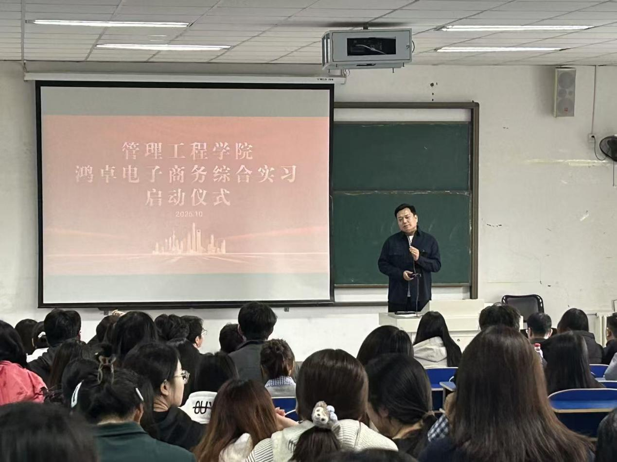 启动仪式上,院长黄德金阐述了本次实训的重要意义和总体安排。本项综合实训是管理工程学院校企合作、协同育人的有效探索,已开展多年,效果良好。这一实训形式整合了学院教学资源与企业实战经验,解决了学生理论学习与实践训练相脱节的问题。能让学生把所学专业知识串联起来,然后在真实业务场景中提高实操技能、团队协作能力与职业素养。黄德金要求,同学们要遵守实习纪律,珍惜实训机会,在实战中积累经验,提升自身专业能力,为高质量就业创业打好基础。