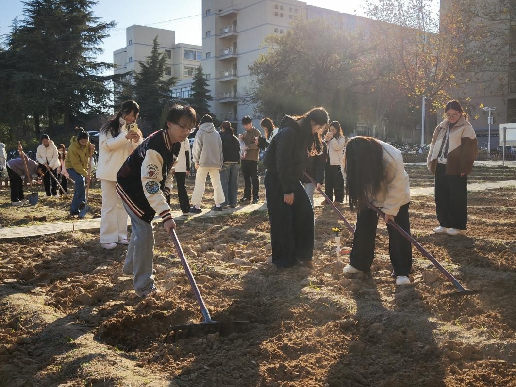 活动过程中,阳光温柔包裹着师生们劳作的身影。学生们手持铁锹、锄头、铁耙等工具,分组分工默契配合:深耕松土、精准开沟、均匀撒种、细致覆土,师生们弯腰劳作有条不紊,田间地头呈现出热火朝天又暖意十足的景象。大家在阳光与汗水交织中,体验到农耕的辛劳与乐趣,以实际行动践行劳动精神,在泥土与阳光中体悟耕耘的意义,用实干传递担当与温暖。
