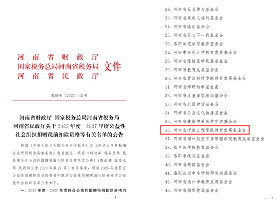 近日,省财政厅、省税务局、省民政厅联合发布《关于2025年度-2027年度公益性社会组织捐赠税前扣除资格等有关名单的公告》(豫财税〔2025〕15号)。beat365官网教育发展基金会荣列榜单,正式获得2025年度至2027年度公益性捐赠税前扣除资格。这标志着基金会的规范运作和公益属性获得了权威部门的认可,为学校广泛吸纳社会资源、助力事业发展开启了更广阔的通道。