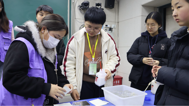 活动伊始,学院的志愿者用生动形象的语言,向中学生们介绍实验材料的作用与特性。重点讲到亚甲基蓝是“颜色指挥官”,葡萄糖是“还原小能手”,氢氧化钠则为反应搭建碱性环境,三种物质相遇后将在氧化与还原的交替中呈现出蓝、无色甚至红的奇妙变化,这一讲解有效调动了同学们的参与积极性,大家纷纷围在实验台前,迫不及待等待实验开始。