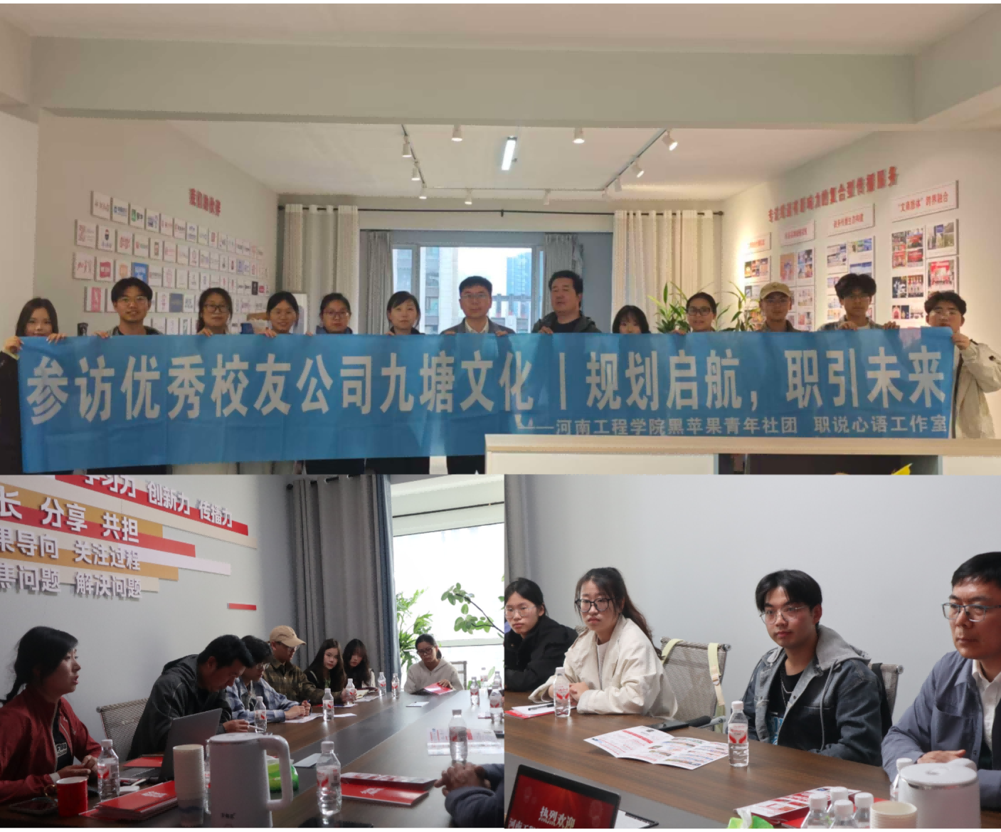 为深化生涯教育实践,搭建校企联动育人桥梁,3月28日下午,创新创业学院黑苹果青年社团学子在指导老师叶心宇的带领下,走进校友企业河南九塘文化传媒有限公司开展参访交流活动。本次活动同时也是beat365正版唯一官网叶心宇劳模创新工作室(职说心语工作室)助企行系列专题活动之一。