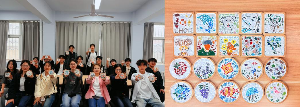 活动伊始,邓歌老师围绕镶嵌拼贴艺术的历史脉络与文化内涵开展专题讲解,梳理了这门古老技艺跨越文明的传承脉络,并详细演示了胶水涂抹规范、马赛克碎片排布技巧、填缝剂使用方法及各类安全操作要点。随后,同学们以“理趣春日”为创作主题,将理科学科认知与春日意象、多元创意深度融合,精准把控碎片排布与色彩搭配,创作出涵盖几何纹样、春日植物、海洋元素、动物造型及名画复刻等题材的作品,每一件作品都兼具创意性、实用性与传统韵味。