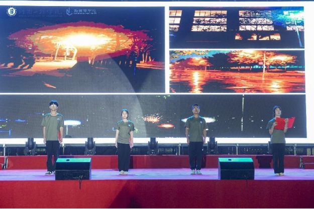 开学典礼在军训方阵现场展演中拉开序幕。典礼伊始,全体起立并奏唱《中华人民共和国国歌》。